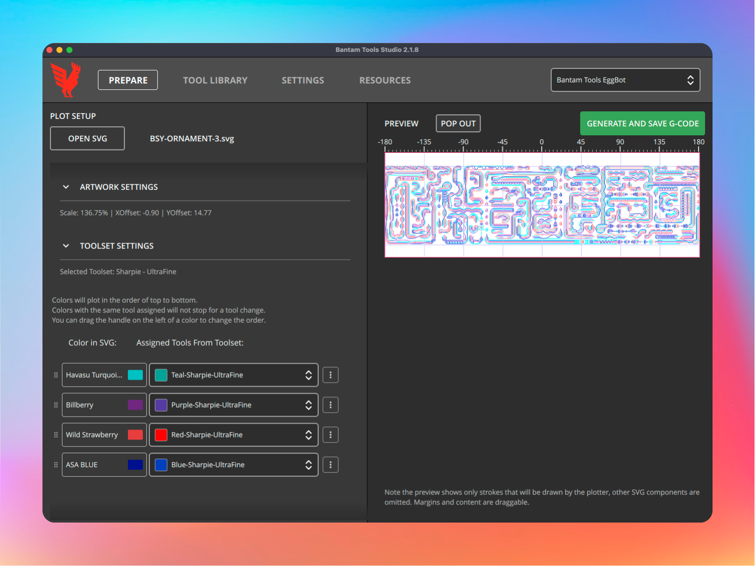 We’ve teamed up with some of your favorite pen plotter artists to make this release extra special. The Bantam Tools EggBot™ Ornament Edition comes loaded with a curated collection of artist-made designs on the included micro SD card, so you can start drawing works of art the moment you power it on.