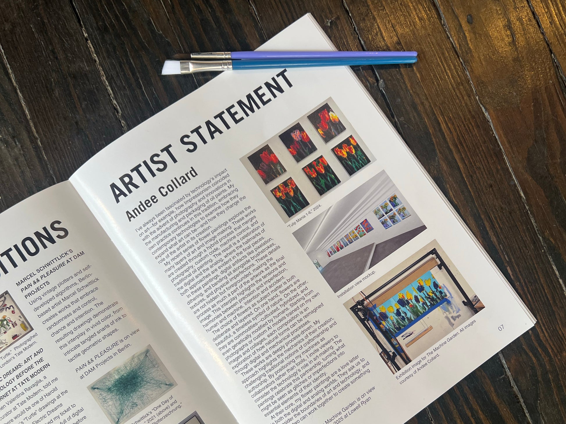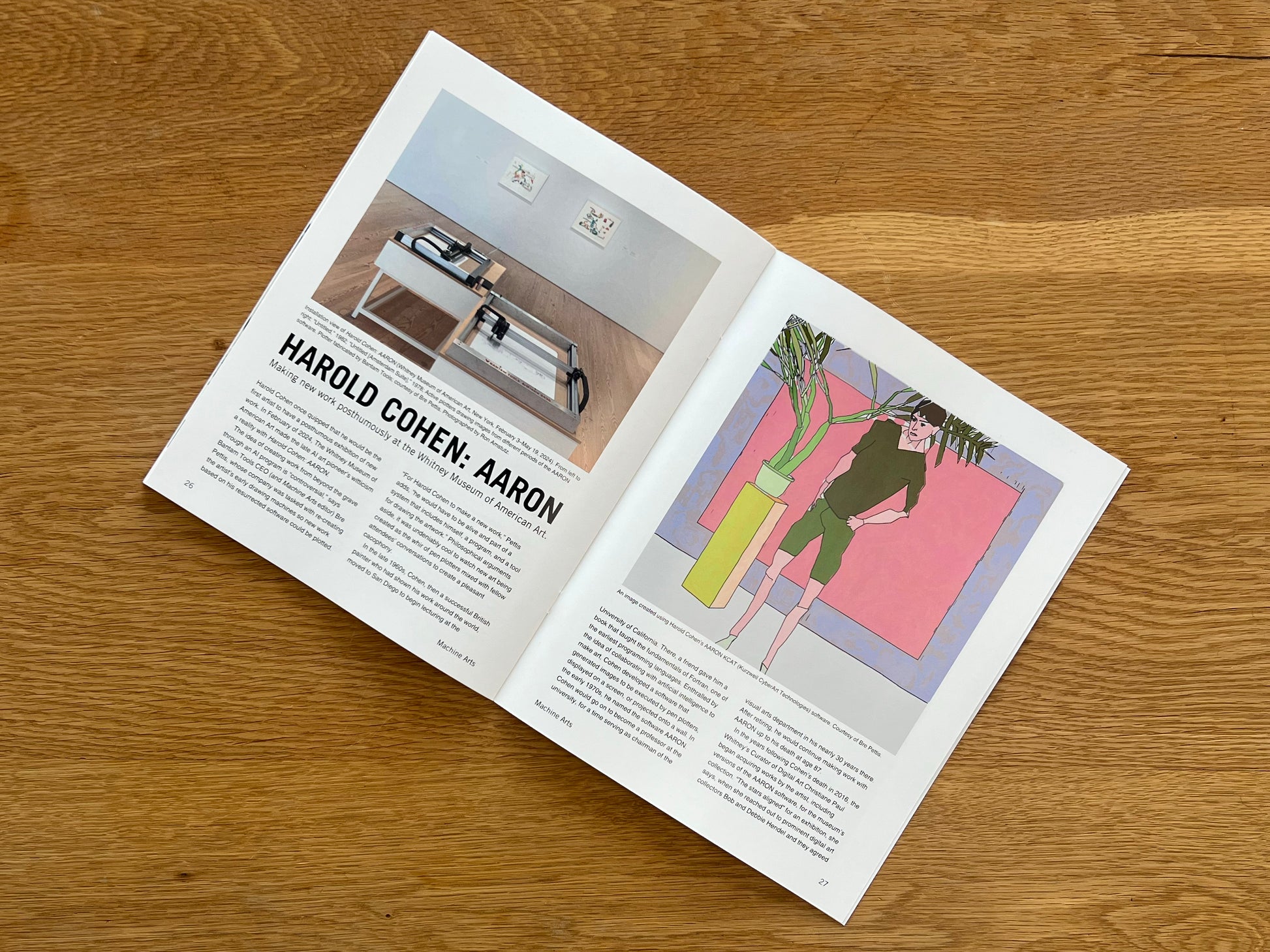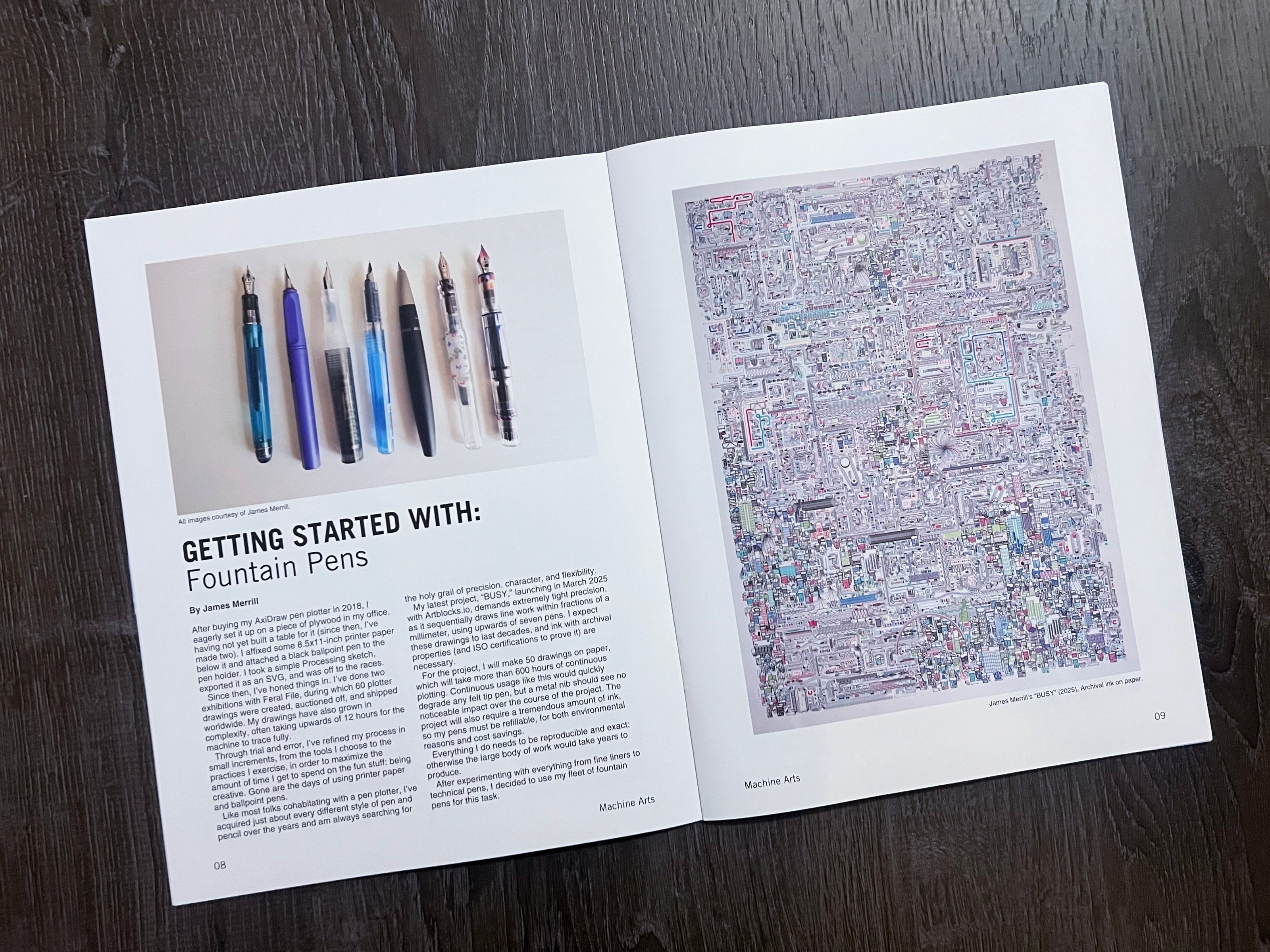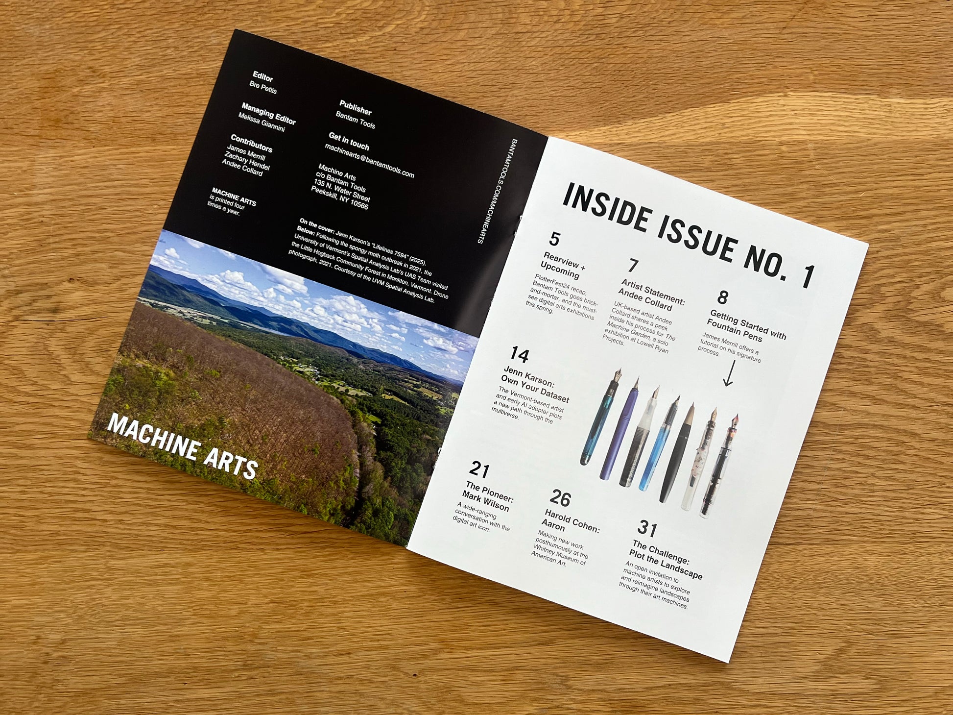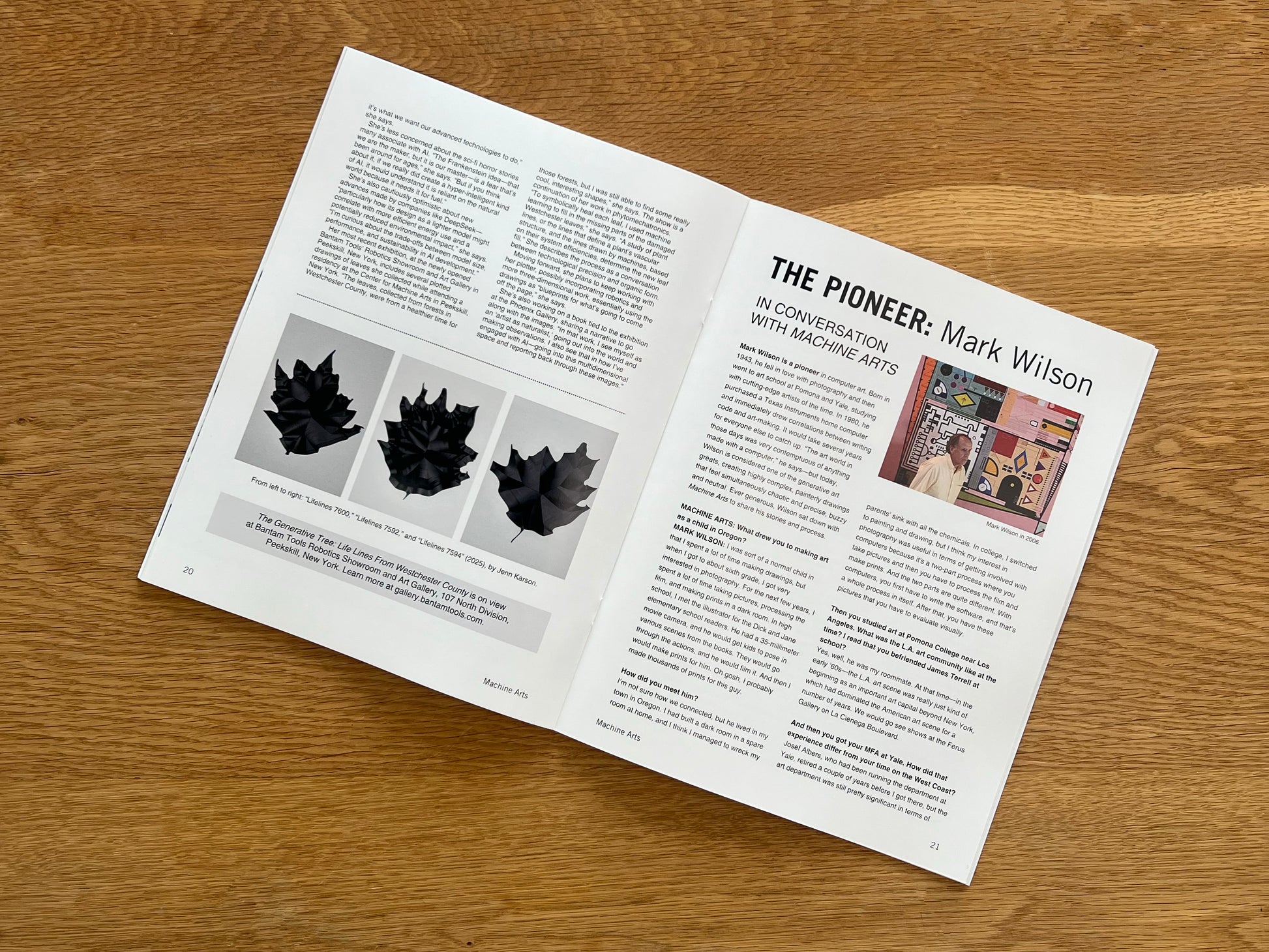 This issue features Jenn Karson, a Vermont-based artist who uses AI and CNC tools to "heal" damaged leaves and explore the ecological potential of artist-made datasets. We sit down with generative art pioneer Mark Wilson for a rich interview about code, chaos, and his 40-year journey in computer art. The legacy of Harold Cohen lives on in a feature on how Bantam Tools helped bring new work by the late artist to life using his original AI code and custom-built plotters. UK artist Andee Collard shares insights into his solo exhibition, The Machine Garden, which explores the interplay between mechanical and organic systems. Rounding out the issue, James Merrill offers a detailed guide to fountain pens, covering everything from pen selection to ink and paper choices for generative work. Plus plenty of surprises, tools, and inspiration.