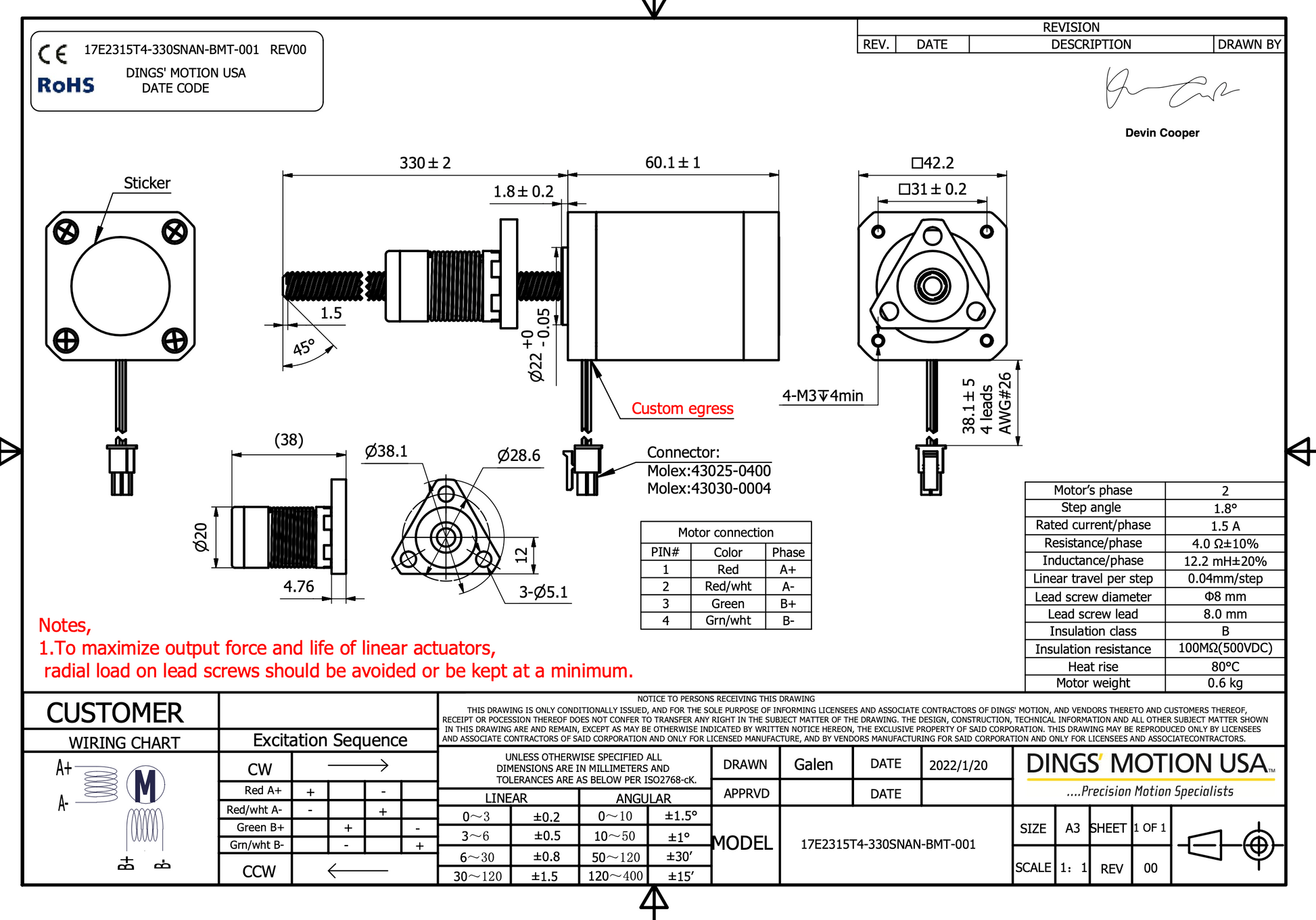 NEMA 17 Stepper Motor 330mm integrated lead-screw